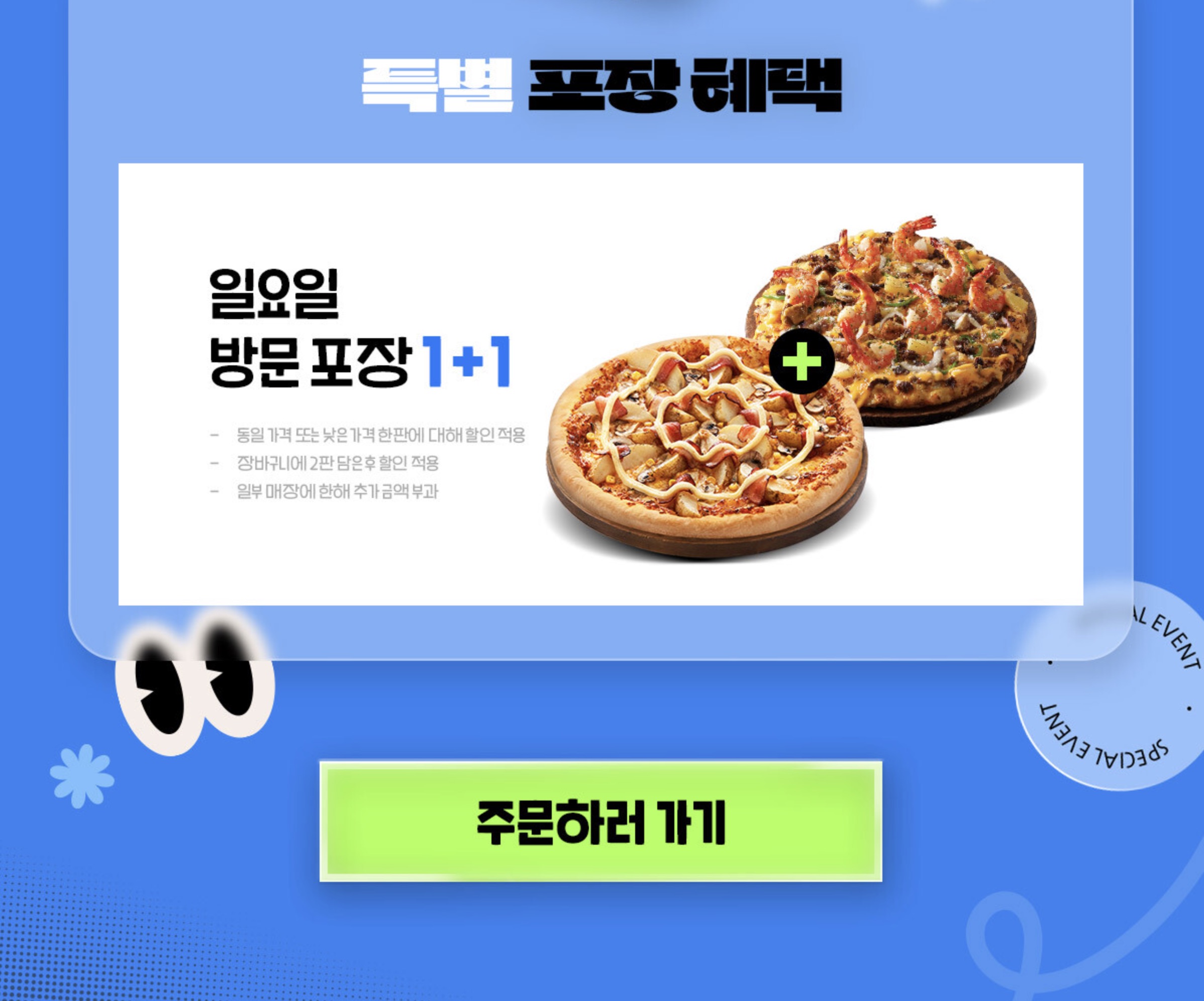 - 매주 목요일, 도미노피자에서 방문포장 주문을 하면 1+1 혜택을 받을 수 있어요.