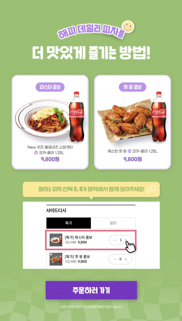 - 1+1 행사 대상 피자 2개 선택 후 결제